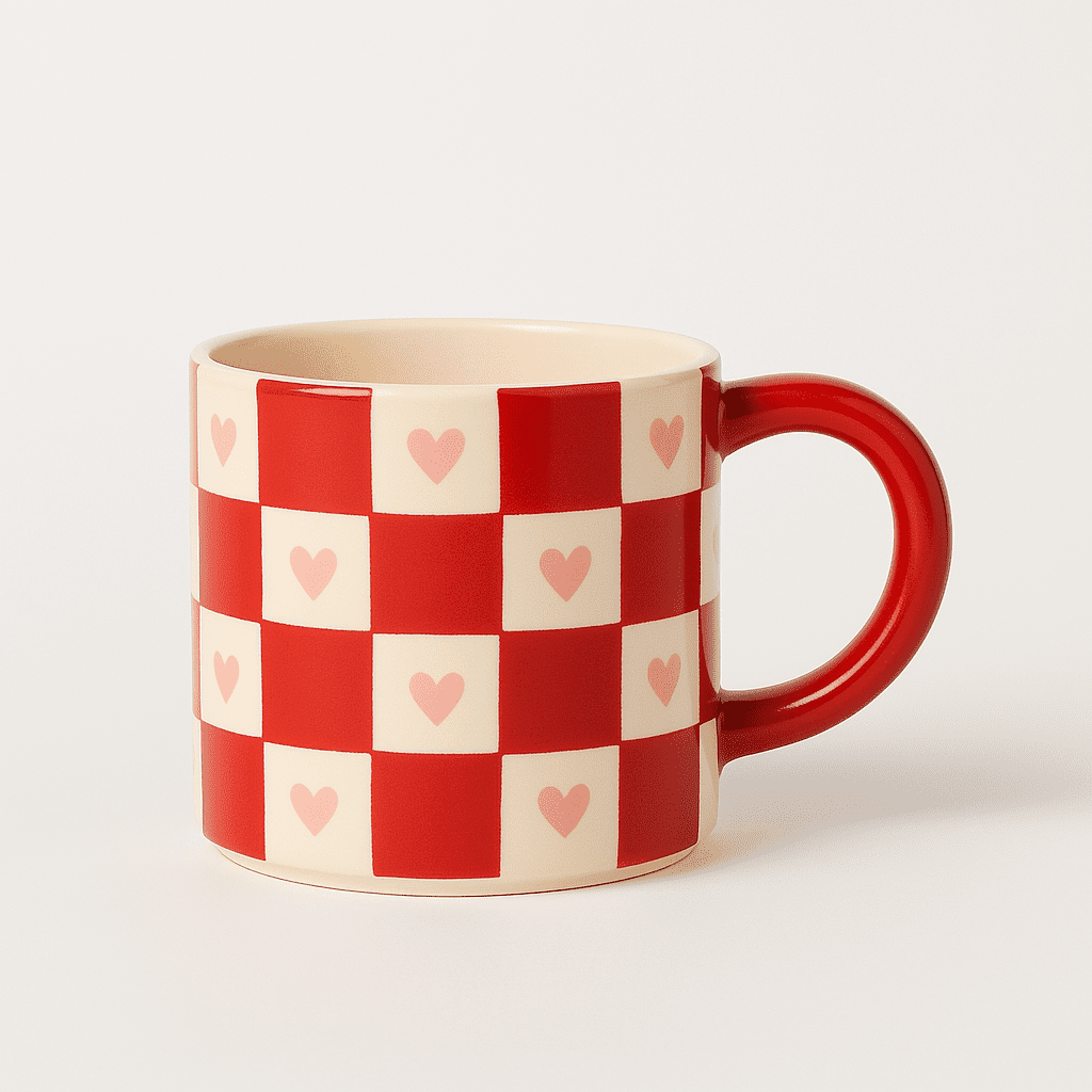♡ Tasse « Rosalie » : Une tasse élégante à carreaux avec des cœurs, parfaite pour déguster votre thé avec style. Son motif raffiné et sa forme confortable vous permettent de savourer chaque gorgée avec un sourire.